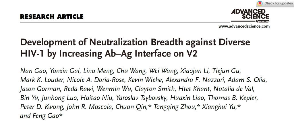 高峰教授、于湘晖教授科研团队针对目前已知报道感染时间最长的恒河猴动物模型作为研究对象,分析其体内诱导产生的广谱中和活性。通过抗体分离获得针对特异表位的J038广谱中和抗体谱系。该工作研究抗体谱系以及体内病毒包膜蛋白的突变情况,追溯广谱中和抗体的进化过程以及与SHIV共同进化的过程,分析非人类灵长动物体内与人体内产生广谱中和抗体的类似性,为更好地应用恒河猴模型来评价HIV-1疫苗提供理论和实验依据。该J038谱系抗体的发育细节和识别特征为今后V2靶向广谱中和抗体的研究和应用提供了新的见解。该研究成果于2022年03月24日在学术期刊《Advanced Science》在线发表(Development of Neutralization Breadth against Diverse HIV-1 by Increasing Ab–Ag Interface on V2)。论文第一完成单位为快猫视频
