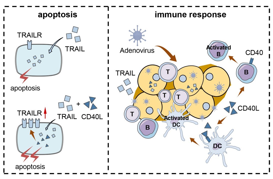 肿瘤微环境的免疫状态是决定抗肿瘤免疫治疗效果的关键因素。课题组前期研究证明,表达肿瘤坏死因子相关凋亡诱导配体(TRAIL)的溶瘤腺病毒(CRAd5-TRAIL)在多种人肿瘤细胞异种移植模型中具有显著的抗肿瘤活性。然而,其在免疫全能小鼠模型中的肿瘤抑制能力及免疫调节机制尚不清楚。因此,研究团队首先在几种小鼠肿瘤模型中探索了CRAd5-TRAIL的抗肿瘤活性,发现其能够增加或激活肿瘤浸润T细胞。为进一步提高抗肿瘤效果,首次将表达小鼠CD40配体(CD40L)的重组腺病毒载体作为免疫激活剂与CRAd5-TRAIL联合用于肿瘤免疫治疗。体内外的研究表明,联合治疗有效地激活了肿瘤微环境中的树突状细胞(DCs)、B细胞和肿瘤浸润T细胞,并通过上调TRAIL受体的表达促进肿瘤细胞凋亡,从而进一步增强了溶瘤腺病毒的抗肿瘤活性。该研究为团队正在开展的溶瘤腺病毒临床前研究以及后续临床研究奠定了基础。快猫视频