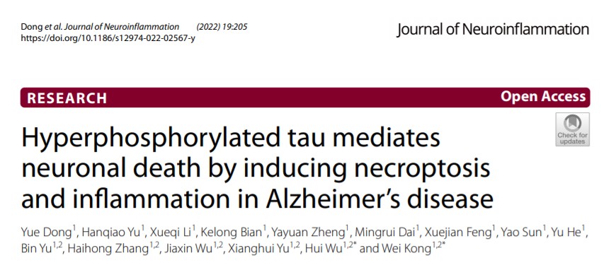艾滋病疫苗国家工程实验室孔维教授/吴慧教授团队,在阿尔茨海默发病机制研究领域取得新进展。相关研究内容已于近日以题为"Hyperphosphorylated tau mediates neuronal death by inducing necroptosis and inflammation in Alzheimer’s disease”发表于Journal of Neuroinflammation杂志。