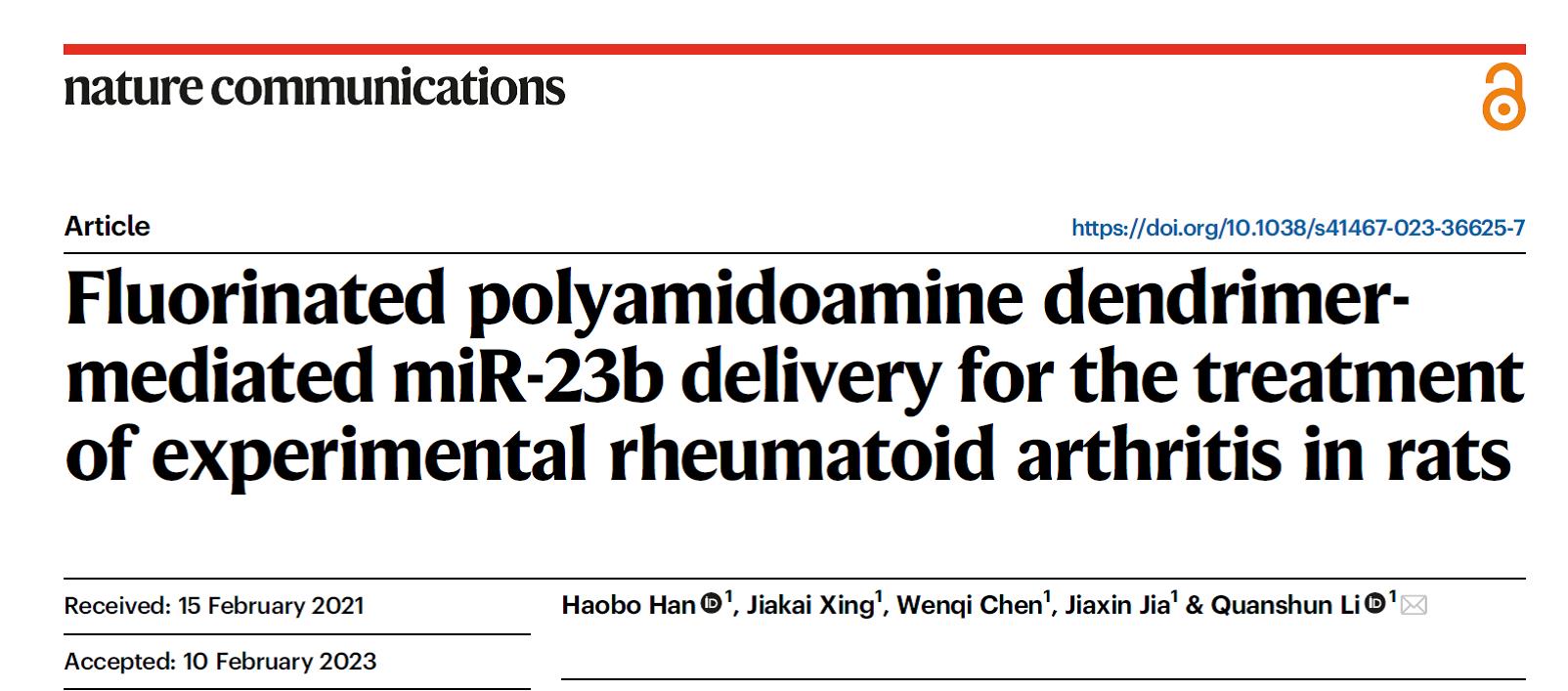 分子酶学工程教育部重点实验室李全顺教授团队,针对类风湿性关节炎的关键信号分子miR-23b,构建氟化修饰型树枝状高分子作为基因递送载体,实现miR-23b在关节炎动物模型中的稳定递送,取得了良好的治疗效果;同时,研究揭示了miR-23b能够抑制TAB2、TAB3以及IKK-α表达,阻断NF-κB炎症信号通路,并诱导巨噬细胞凋亡,实现体内抗炎功能。研究结果以Fluorinated polyamidoamine dendrimer-mediated miR-23b delivery for the treatment of experimental rheumatoid arthritis in rats为题,于2023年2月20日在学术期刊《Nature Communications》正式发表。论文第一完成单位为快猫视频