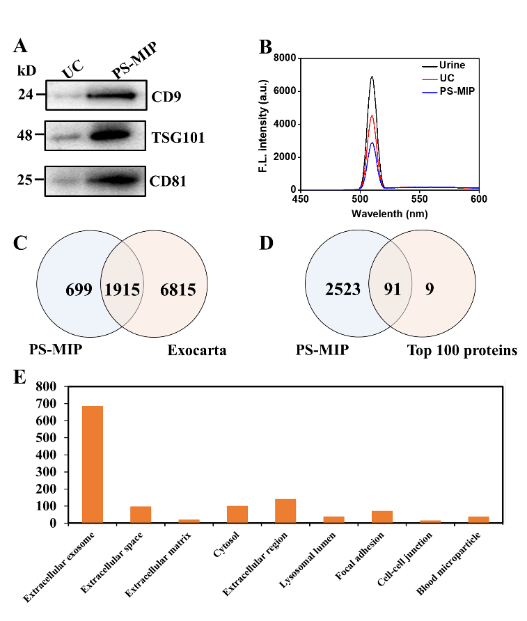 外泌体是细胞分泌的具有磷脂双分子层膜包裹的囊泡状结构小体,与疾病的发生发展有着密切的联系,是疾病标志物筛选的重要来源。因此,磷脂分子印迹材料可通过外泌体外膜表达的磷脂对其进行选择性分离,和传统超速离心方法相比,该方法显示出更高的回收率和特异性(图3)。通过对富集的外泌体蛋白质组学分析,所鉴定到的蛋白中73%来源于外泌体数据库,且Top100蛋白中有91个被鉴定到,Gene Ontology分析表明所鉴定到的绝大多数是细胞外囊泡蛋白,表明了该方法的可靠性和适用性,为基于外泌体的肿瘤液体活检提供了新的技术方案。