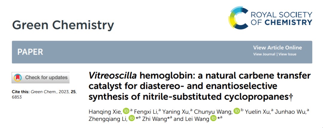 通过对血红蛋白结构和催化机制的进一步理解,课题组以血红蛋白具有的卡宾转移酶活力为基础,探索其在手性合成中的应用,结合分子对接技术多角度分析催化机制,以“Vitreoscilla hemoglobin: A natural carbene transfer catalyst for diastereo- and enantioselective synthesis of nitrile-substituted cyclopropanes”为题,在国际权威学术期刊《Green Chemistry》(影响因子9.8,中科院分区一区)在线发表研究论文。论文中报告了一种对环境友好的策略,将原位生成的重氮试剂与生物催化相结合,用于芳香烯烃的不对称环丙烷化。论文第一完成单位为快猫视频