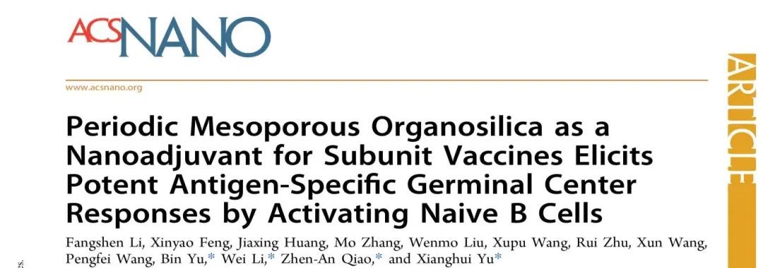 无机合成与制备化学国家重点实验室乔振安教授和复旦大学化学系李伟教授以周期性介孔有机硅(PMO)作为新型亚单位疫苗佐剂,揭示其通过CLR通路直接激活静息B细胞,在免疫后早期引发强效的生发中心反应,并最终诱导机体产生广谱且持久的体液免疫应答和强效的细胞免疫应答。研究论文“Periodic mesoporous organosilica as a nanoadjuvant for subunit vaccines elicits potent antigen-specific germinal center responses by activating naive B cells”发表在《ACS Nano》杂志(影响因子17.1,中科院分区一区)上。论文第一完成单位为快猫视频