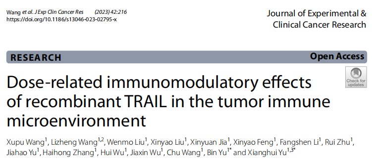 艾滋病疫苗国家工程实验室于湘晖、于彬团队报道了重组TRAIL在TME中扮演着剂量依赖的双向免疫调节作用,并详细阐释了作用机制。同时探讨了癌症治疗中重组TRAIL增强抗肿瘤免疫和抗肿瘤效应的潜在策略。研究论文“Dose-related immunomodulatory effects of recombinant TRAIL in the tumor immune microenvironment”发表在国际学术期刊《Journal of Experimental & Clinical Cancer Research》(影响因子11.3,中科院分区一区)上。论文第一完成单位为快猫视频