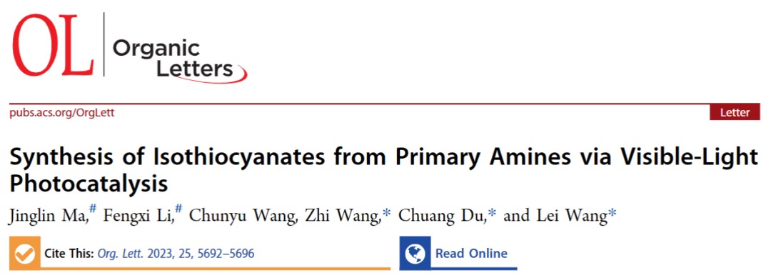 在对酶催化领域进行持续研究的同时,课题组也对光酶催化等新兴研究领域进行涉猎,通过搭建光催化实验装置和前期文献调研,对光催化合成研究有了一定的了解,以“Synthesis of Isothiocyanates from Primary Amines via Visible-Light Photocatalysis”为题,在国际权威学术期刊《Organic letters》(影响因子5.2,中科院分区一区)在线发表研究论文。论文中报道了一种以伯胺和二硫化碳为原料,光催化体系下,高效、温和地合成各种取代异硫氰酸酯的方法。该方法扩大了光催化的应用范围,并为制备脂肪族和芳香族异硫氰酸酯提供了一种新的策略,具有底物耐受范围广、对环境友好、可见光驱动的优点。论文第一完成单位为快猫视频