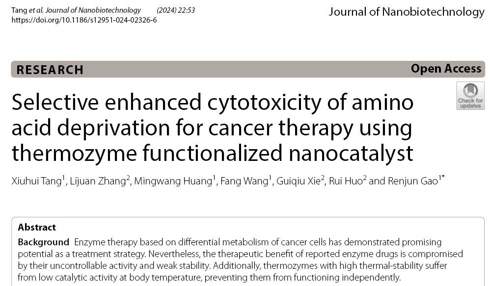 酶法治疗是很有潜力的癌症治疗策略,已报道的常温酶药物由于活性不可控、短半衰期等问题而使其治疗效果大打折扣。本课题组创造了一种新型的嗜热酶疗策略,用于乳腺癌的精准催化治疗:将嗜热精氨酸酶和天冬氨酸酶与纳米金和透明质酸偶联为纳米催化剂,靶向癌细胞后,用红外激光特异性激活嗜热酶消耗癌细胞内的氨基酸,诱发细胞凋亡,并协同光热治疗,有效杀伤了癌细胞。该疗法副作用小,范围可控,是一种有潜力的抗癌策略,相关结果发表在Journal of Nanobiotechnology,论文第一完成单位为快猫视频