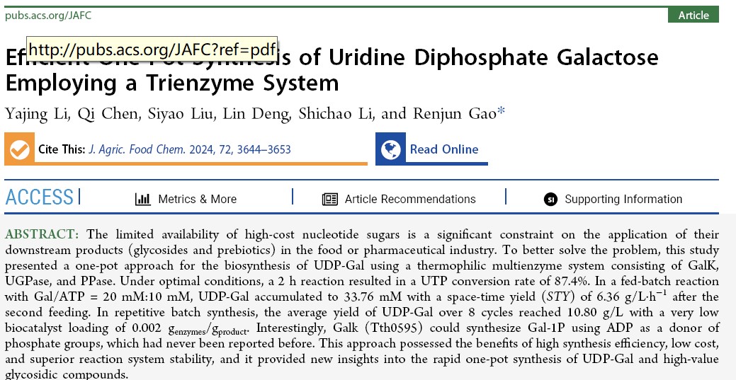 高成本核苷酸糖是限制糖苷和益生元等在食品或制药工业中应用的重要因素。为了节省成本和提高合成产量,工业上通常采用级联酶法合成核苷酸糖和糖苷。本研究构建了由GalK、UGPase和PPase组成的嗜热酶催化系统,可实现UDP-半乳糖的规模化合成。该体系成功将UDP-半乳糖产量提升至33.76 mM,时空产率为6.36 g/L·h-1。在重复批量合成中,经过8次循环后,UDP-半乳糖的平均产率达到10.80 g/L。该多酶体系具有高效率、低成本和良好的系统稳定性等优点,适合进一步开发应用。相关结果发表在Journal of Agricultural and Food Chemistry,论文第一完成单位为快猫视频