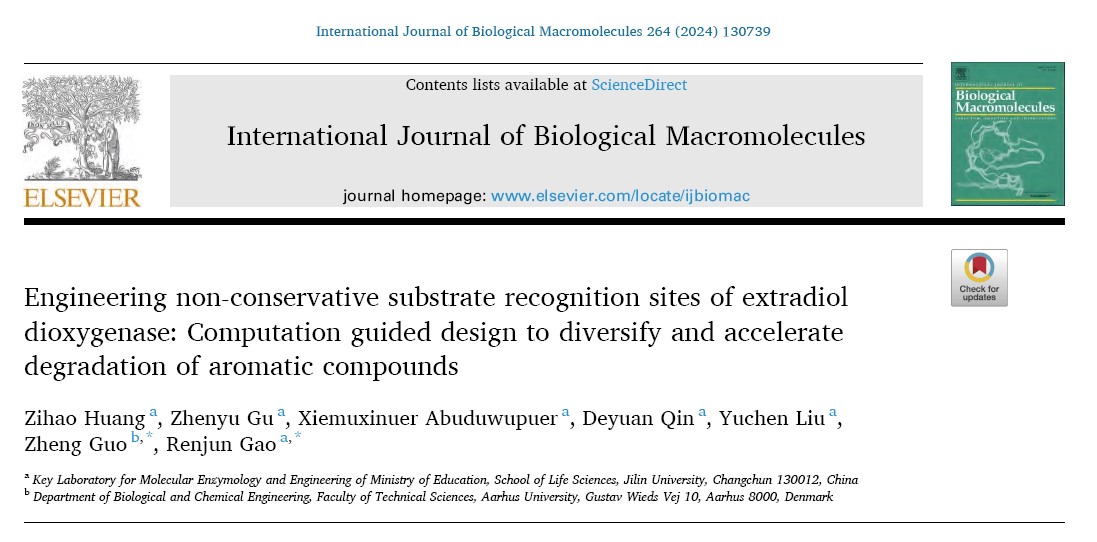 酚类是主要的环境污染物,外二醇双加氧酶是酚类降解的关键酶,高仁钧教授和郭诤教授团队合作,将前期筛选到的外二醇双加氧酶Tcu3516进行多序列比对,并将酶与底物进行分子对接。通过半理性设计手段获得了三突变体V186L/V212N/D285A,其催化性能及热稳定性均较野生酶有显著提高,可用于环境中邻苯二酚的降解。分子动力学模拟表明在三个突变位点的协同作用下,该酶获得了更稳定的核心及更灵活的活性腔入口,这为该酶的后续应用和进一步改造打下了基础。相关结果发表在International Journal of Biological Macromolecules,论文第一完成单位为快猫视频