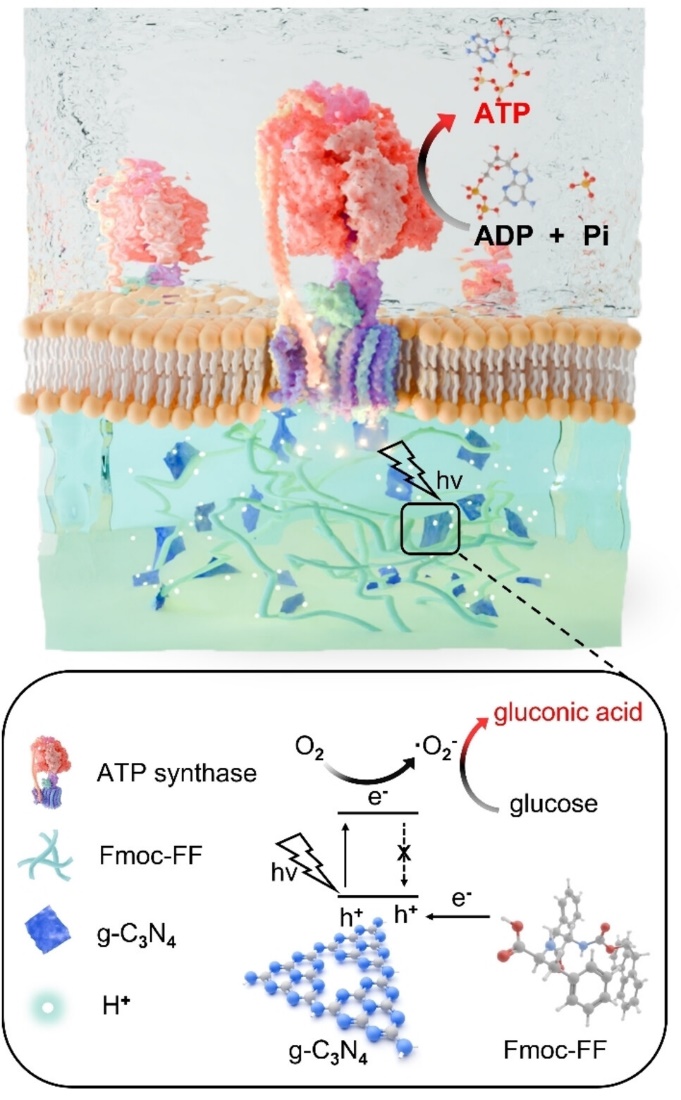 李悦/李自博课题组构筑了一种二肽水凝胶支撑的ATP合酶组装体系,通过预先包埋g-C3N4纳米片于Fmoc-FF水凝胶,利用二者协同的电子耦合效应,在水凝胶内外构造光控的质子梯度,用于驱动ATP合酶催化生成ATP(图 1)。极细的纳米纤维为g-C3N4超薄纳米片提供了良好的分散位置,有效提升了体外光合磷酸化效率,拓宽了二肽水凝胶在仿生器件领域的实际应用。相关研究”A well-coupled supramolecular system accelerates photophosphorylation”发表于国际学术期刊Angewandte Chemie International Edition(2025,e202417474)。此项研究工作得到了国家自然科学基金重大项目、国家自然科学基金青年项目、科技部重点研发计划的支持。论文第一完成单位为快猫视频