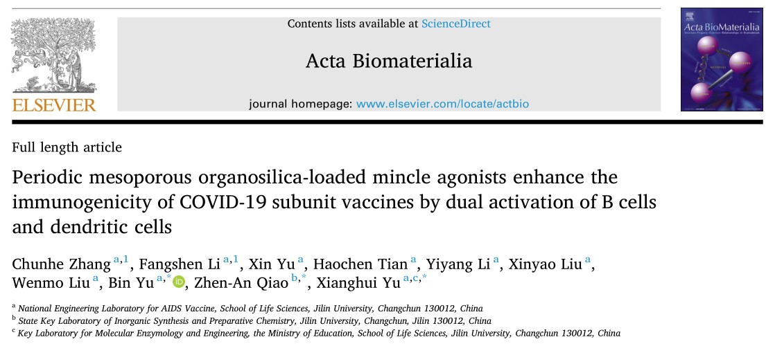 无机合成与制备化学国家重点实验室乔振安教授合作,设计了一种复合型的纳米佐剂TDB@PMO,研究发现其能有效地将抗原递送到淋巴结,增强APC的抗原提呈。同时,TDB@PMO佐剂可同时激活B细胞和DC细胞的固有免疫Mincle信号通路,进一步增强生发中心(GC)应答和SARS-CoV-2 特异性的体液和细胞免疫反应。相关研究成果以“Periodic mesoporous organosilica-loaded mincle agonists enhance the immunogenicity of COVID-19 subunit vaccines by dual activation of B cells and dendritic cells”为题在《Acta Biomaterialia》杂志发表。
