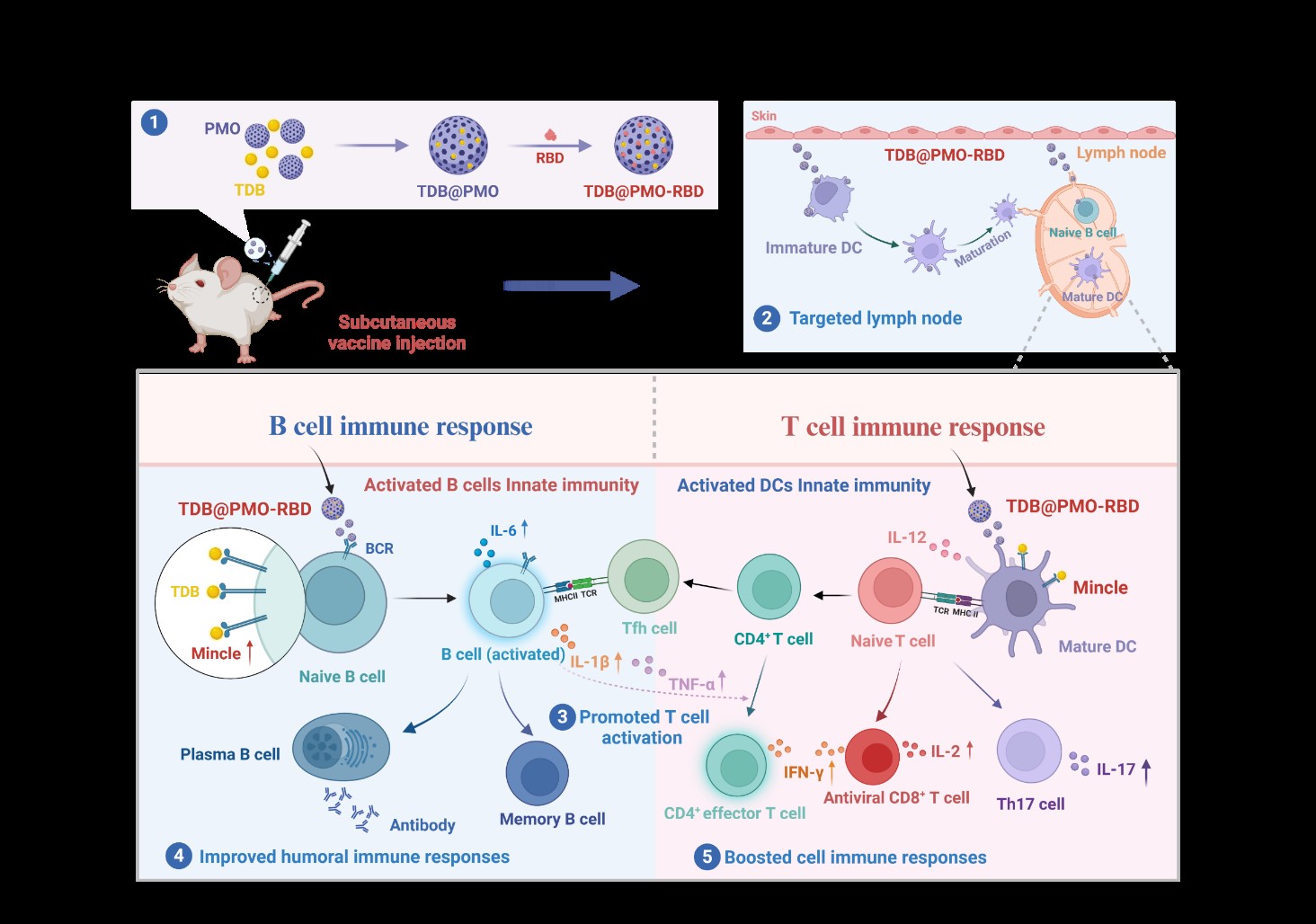 由SARS-CoV-2感染引起的 COVID-19大流行严重危害了人类健康和公共安全。而疫苗接种是有效控制疫情蔓延的重要措施之一。佐剂作为亚单位疫苗的组成部分,扮演着重要的作用在引起强烈而持久的免疫应答反应。而高突变病毒(如冠状病毒)的出现对佐剂的设计提出了新的要求。因此,开发一种既能诱导体液免疫又能激发细胞免疫反应的复合型纳米佐剂,对于设计有效预防冠状病毒等病原体的亚单位疫苗至关重要。本研究利用课题组前期发现的PMO作为纳米佐剂的优势和特性,在其基础上进行修饰,设计一种复合型的纳米佐剂TDB@PMO。研究发现,TDB@PMO能够通过激活Mincle信号通路同时增强对 B 细胞和 DC 细胞的激活,进而增强了B细胞和T细胞的响应。并作为疫苗佐剂免疫后能够显著提升生发中心应答,引起较强的体液免疫反应。同时其能引起较强的系统性CD4+ T细胞和CD8+ T细胞响应,并促进脾细胞中 IFN-γ 和 IL-2 分泌,显著提升了细胞免疫应答水平。本研究为新型纳米佐剂开发以及进一步提升蛋白亚单位疫苗的免疫原性提供策略和依据。