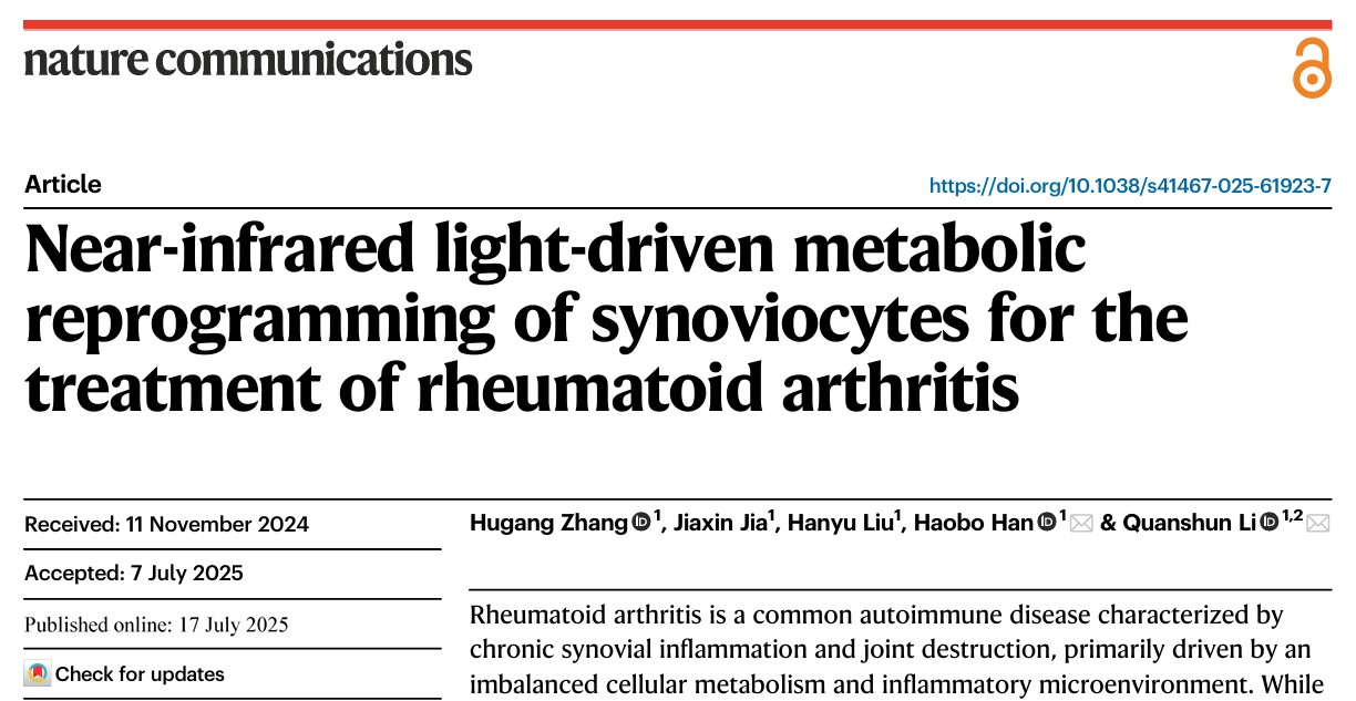 分子酶学工程教育部重点实验室李全顺/韩浩博团队,前期研究中系统探究了miRNA在类风湿性关节炎发生发展中的关键角色,构建了多种基因治疗体系(Nat. Commun. 2023, 14: 944; J. Control. Release 2025, 383: 113832)。在此基础上,针对类风湿性关节炎异常激活的糖酵解信号通路,构建了上游为HSP70热响应启动子的血红素单加氧酶-1(HO-1)基因元件,通过近红外光驱动模式实现了该基因在病变关节组织中的精准表达,通过对底盘滑膜细胞表型的调控及炎症微环境的重塑,在类风湿性关节炎基因治疗方面取得了良好的效果。研究成果以Near-infrared light-driven metabolic reprogramming of synoviocytes for the treatment of rheumatoid arthritis为题,于2025年7月17日在学术期刊Nature Communications正式发表。该论文第一完成单位为快猫视频