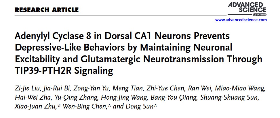朱筱娟教授团队、广州医科大学基础医学院陈文兵教授团队,在抑郁症发病机制研究领域取得重要突破。该研究通过整合行为学、高通量测序、电生理记录及钙信号光纤成像等技术手段,创新性提出背侧海马腺苷酸环化酶8(ADCY8)功能异常是抑郁症发生的关键风险因素,为抑郁症的病理机制阐释和靶向干预提供了全新的理论依据。研究成果于2025年12月12日在国际学术期刊《Advanced Science》上发表。