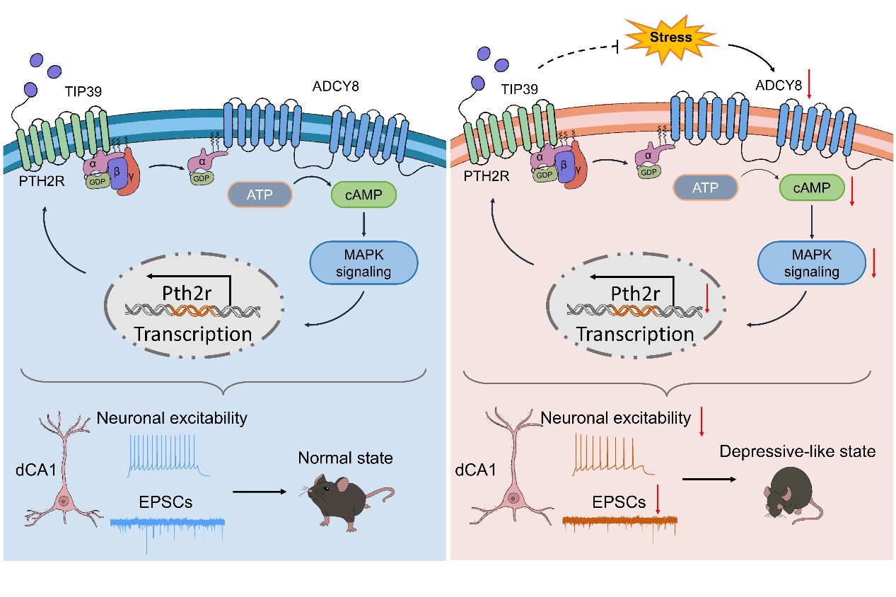 在后续机制研究中,研究团队通过高通量测序筛选、分子生化等实验方法,鉴定出海马TIP39-PTH2R信号通路是ADCY8调节小鼠抑郁样行为的关键下游通路(图2)。利用AAV-shRNA特异性敲低海马PTH2R表达后,dCA1神经元的电生理兴奋性与EPSCs均出现显著下降;而上调PTH2R表达,则可有效挽救Adcy8基因敲除小鼠dCA1神经元的功能缺陷,同时逆转其抑郁样行为表型。这一研究成果不仅深化了领域内对ADCYs家族功能异常参与抑郁症发病过程的认知,同时还提示ADCY8-TIP39-PTH2R通路可作为抗抑郁治疗的全新潜在靶点,为后续新型抗抑郁药物的研发开辟了新方向。