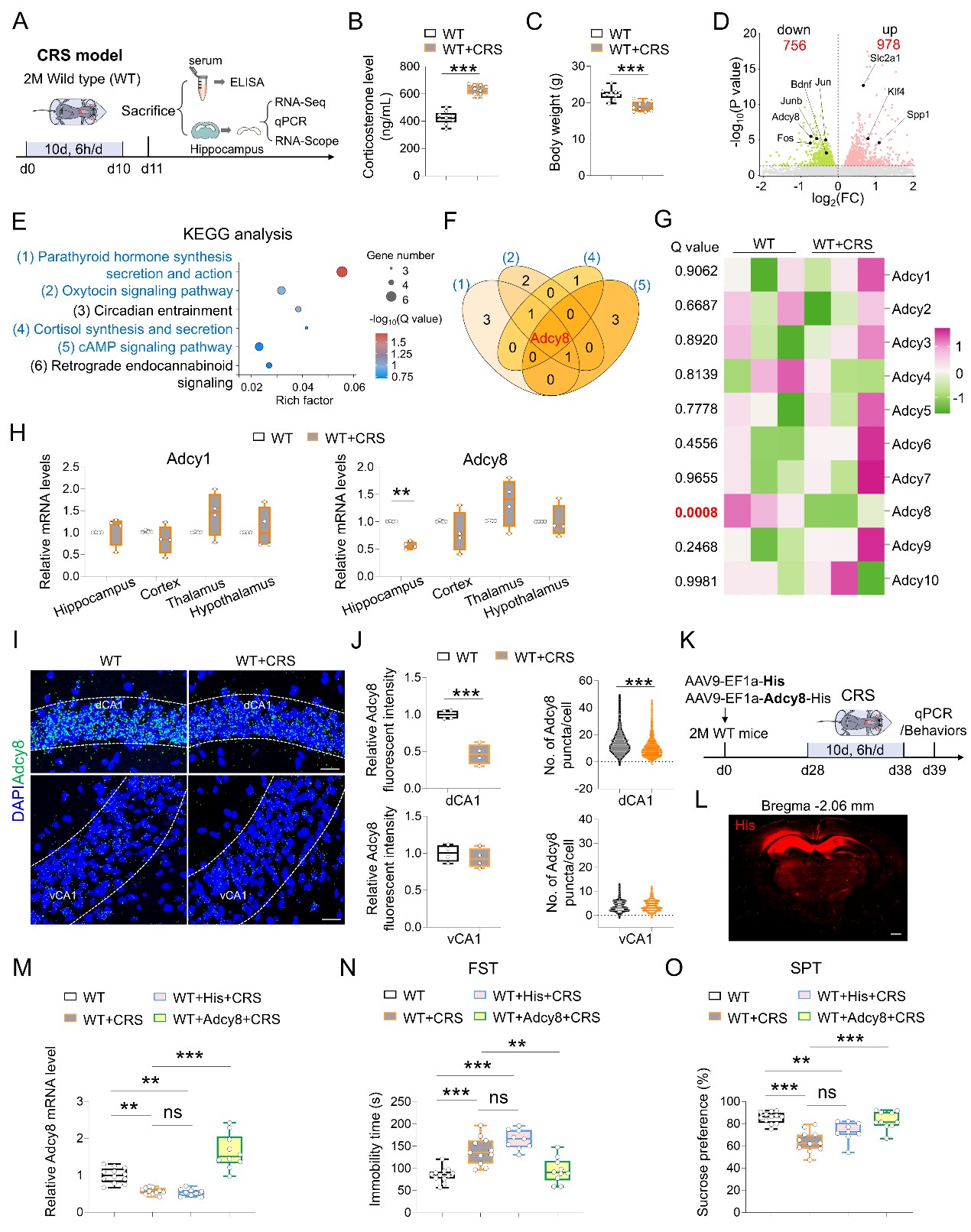 图1. 慢性应激特异性降低dCA1神经元中Adcy8基因表达