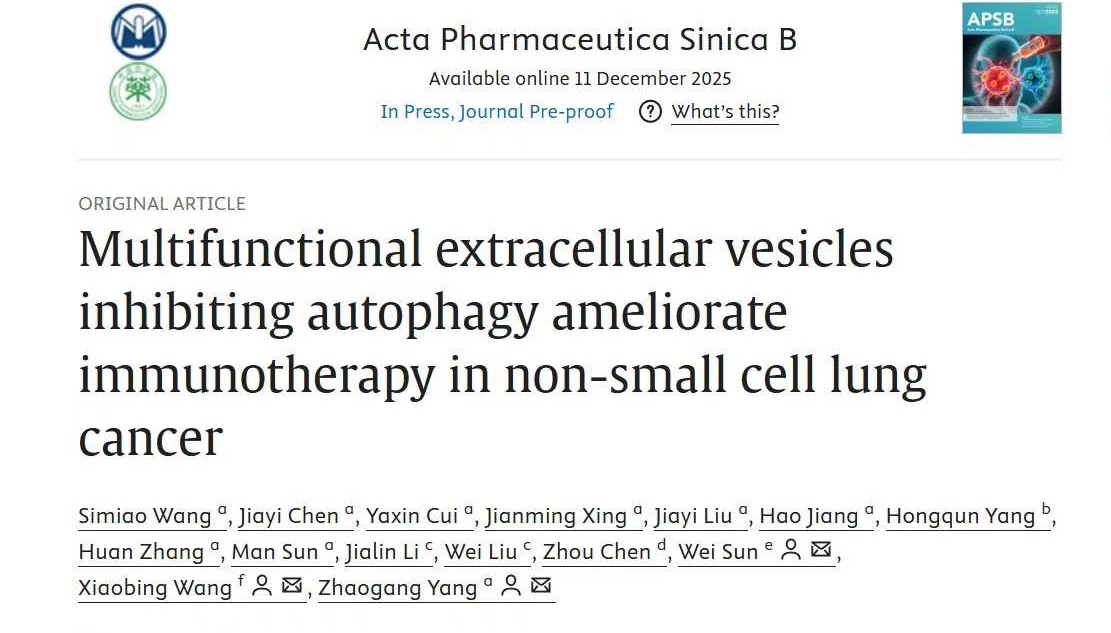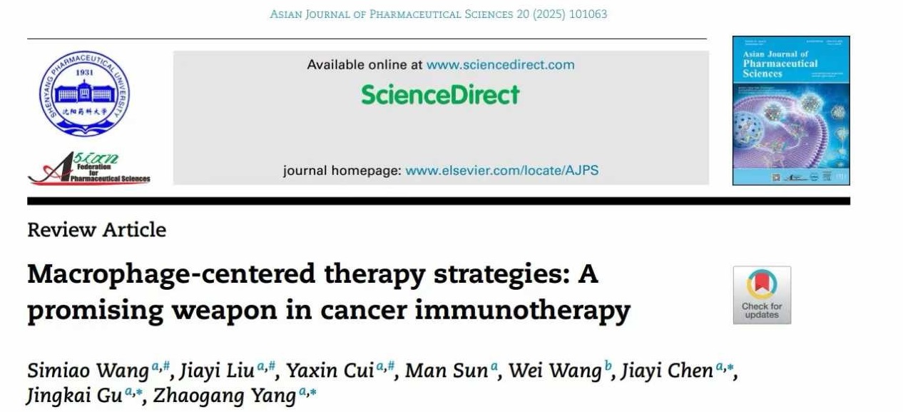 此外,团队还及时对该领域的研究动态进行了系统性梳理与展望,围绕“外泌体在癌症免疫治疗中的应用”及“巨噬细胞在肿瘤免疫治疗中的作用”两大前沿方向分别发表综述论文。相关成果分别发表于国际知名期刊《Medcomm》(生科院博士生陈嘉怡为第一作者,杨照罡教授为通讯作者)与《Asian Journal of Pharmaceutical Science》(生科院博士生王思邈、硕士生刘佳溢、博士生崔雅欣为共同第一作者,顾景凯教授与杨照罡教授为共同通讯作者)。
