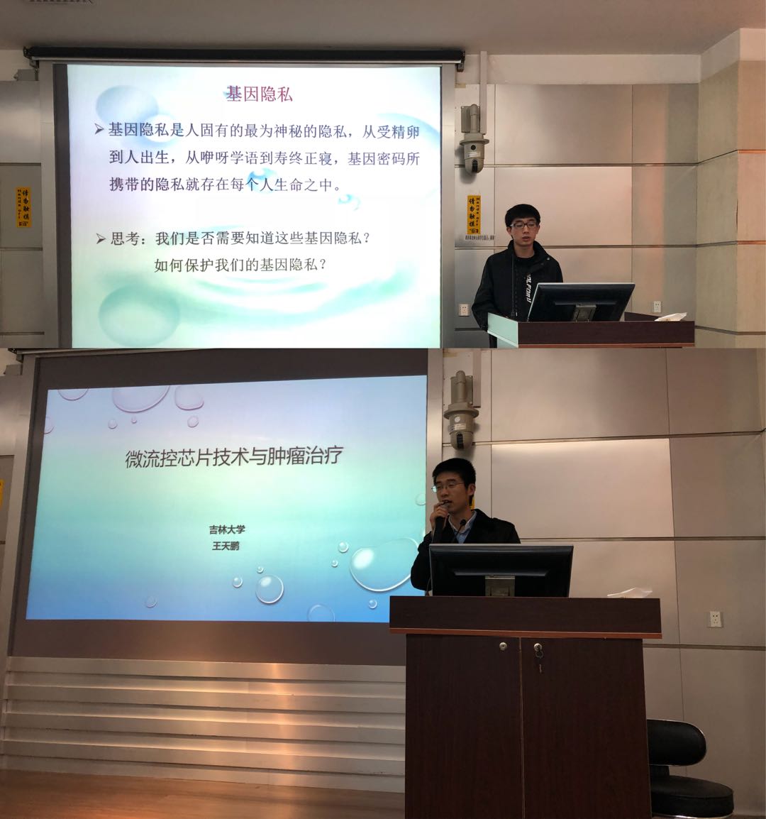 研究生杨洁冰、王天鹏两位同学分别为大家做了题为“人类基因组和基因技术”和“微流控芯片技术与肿瘤治疗”的学术讲座,内容深入浅出、充满趣味,赢得了在场师生的热烈掌声。讲座结束后,在国家级生物实验教学示范中心老师的带领下,来访师生们对实验中心进行了参观,对于中心各种先进的现代化仪器设备,参观的学生们显得兴致勃勃,并与老师们进行了积极互动。参观结束后,来访师生游览了快猫视频
