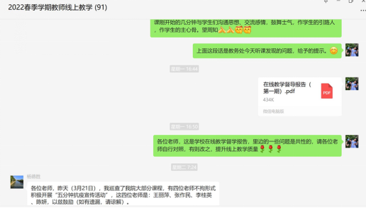 结合学校 “2022年春季学期在线教学督导工作”要求,学院领导、督学以及教学委员会充分深入在线教学第一线,开展教学检查及督导,实时把握在线教学的情况,将共性问题和优秀案例及时公布,有效开展监督的同时,助力在线教学质量不断提高。