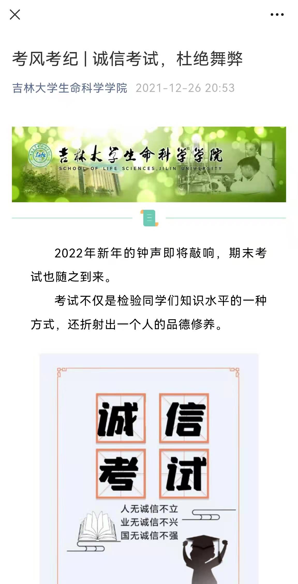 2021年12月26日,院学工办在学院公众号上发布了《考风考纪|诚信考试,杜绝舞弊》的推送,倡导优良学风与诚实诚信,并分年级召开了诚信考试教育动员会,要求全体学生严格遵守考试纪律,做到诚信应试,同时组织全体学生签订了《快猫视频