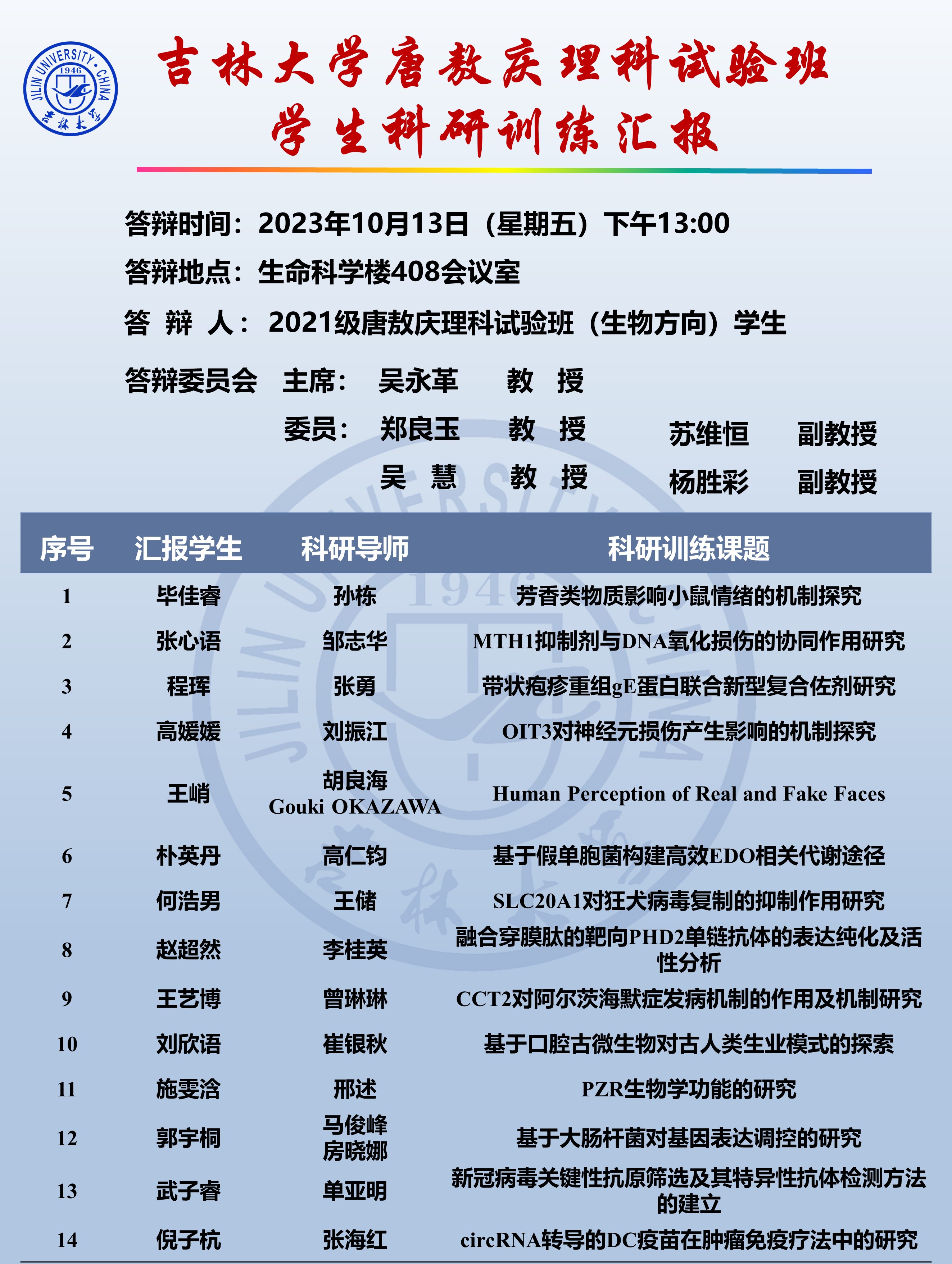 于10月13日下午组织开展了唐敖庆理科试验班生物方向(唐生班)拔尖学生科研训练进展汇报。此次汇报面向全校公开进行,汇报主体为2021级唐生班全体学生和2020级唐生班学生代表,邀请吴永革教授、郑良玉教授、吴慧教授、苏维恒副教授、杨胜彩副教授担任专家评委。快猫视频