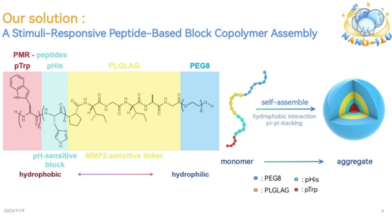 Nano-JLU团队凭借“针对治疗癌症中耐药性问题的新策略:全新设计一种基于多肽的响应式自组装共聚物”项目在总决赛中获得总成绩银奖的成绩。