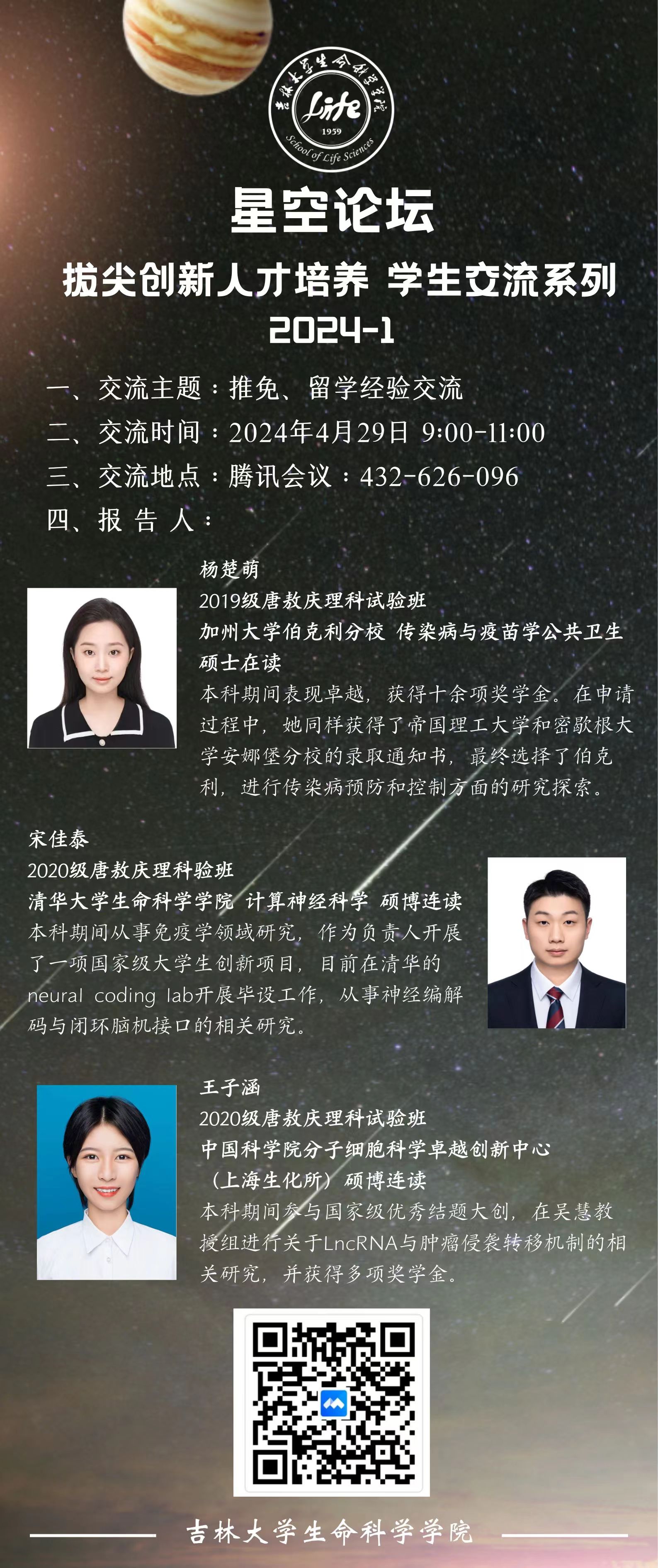 2024年4月29日,学院举办星空论坛·学生交流系列,开展推免、留学经验交流主题分享。