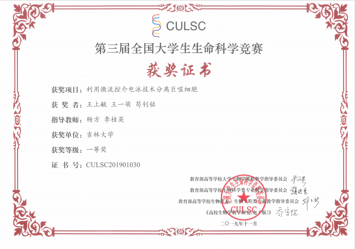 第二届吉林省大学生生命科学竞赛一等奖(2019.11)(第一完成人)