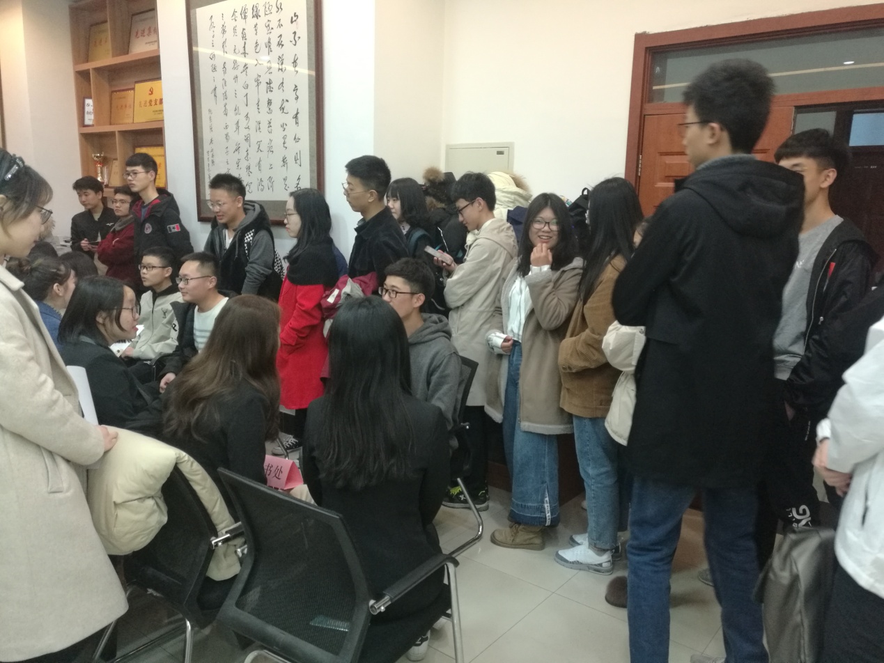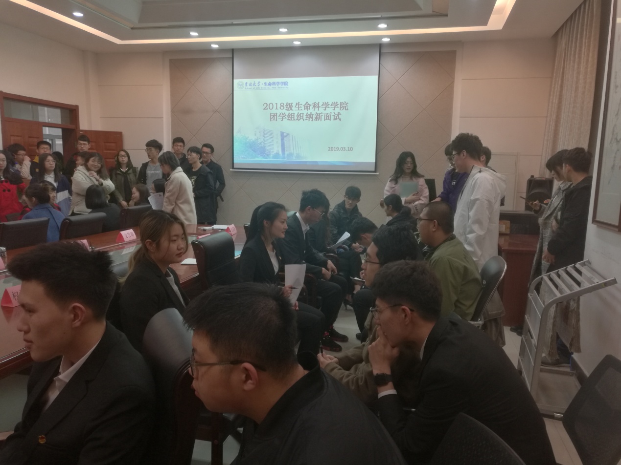 本次纳新面试工作于2019年3月10日17:00在生命科学楼335、107室举行。会前,各个部门成员提前布置好纳新的场所,确保纳新活动有序进行。前来参加纳新的同学有序地向有意愿加入的部门询问相关信息,各部门的部长副部也对新成员进行了严格面试,认真做好面试记录,并向他们明确了加入学生的工作组织所肩负的责任。期间,主席团成员穿梭于各个部门之间,监督纳新的公正公平性,维持纳新活动的正常秩序。