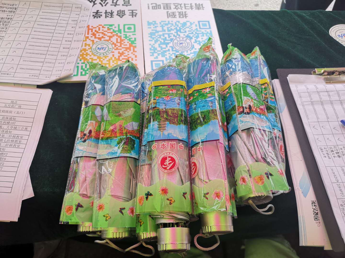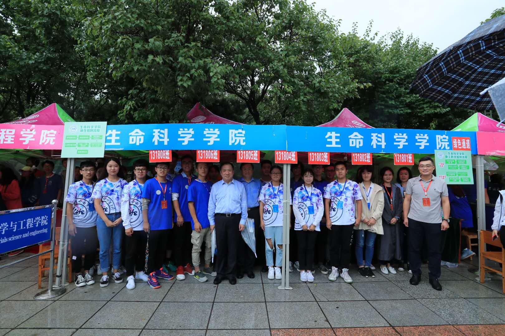 2018级本科新生代班代团及迎新志愿者们就已在五月花集合待命,在微微小雨中布置好了迎新场地,党委副书记崔帅、学工办主任张春阳、辅导员马莹、2018级辅导员丁子芮以及团学联的学生干部们在现场等待着2018级新生前来报到。