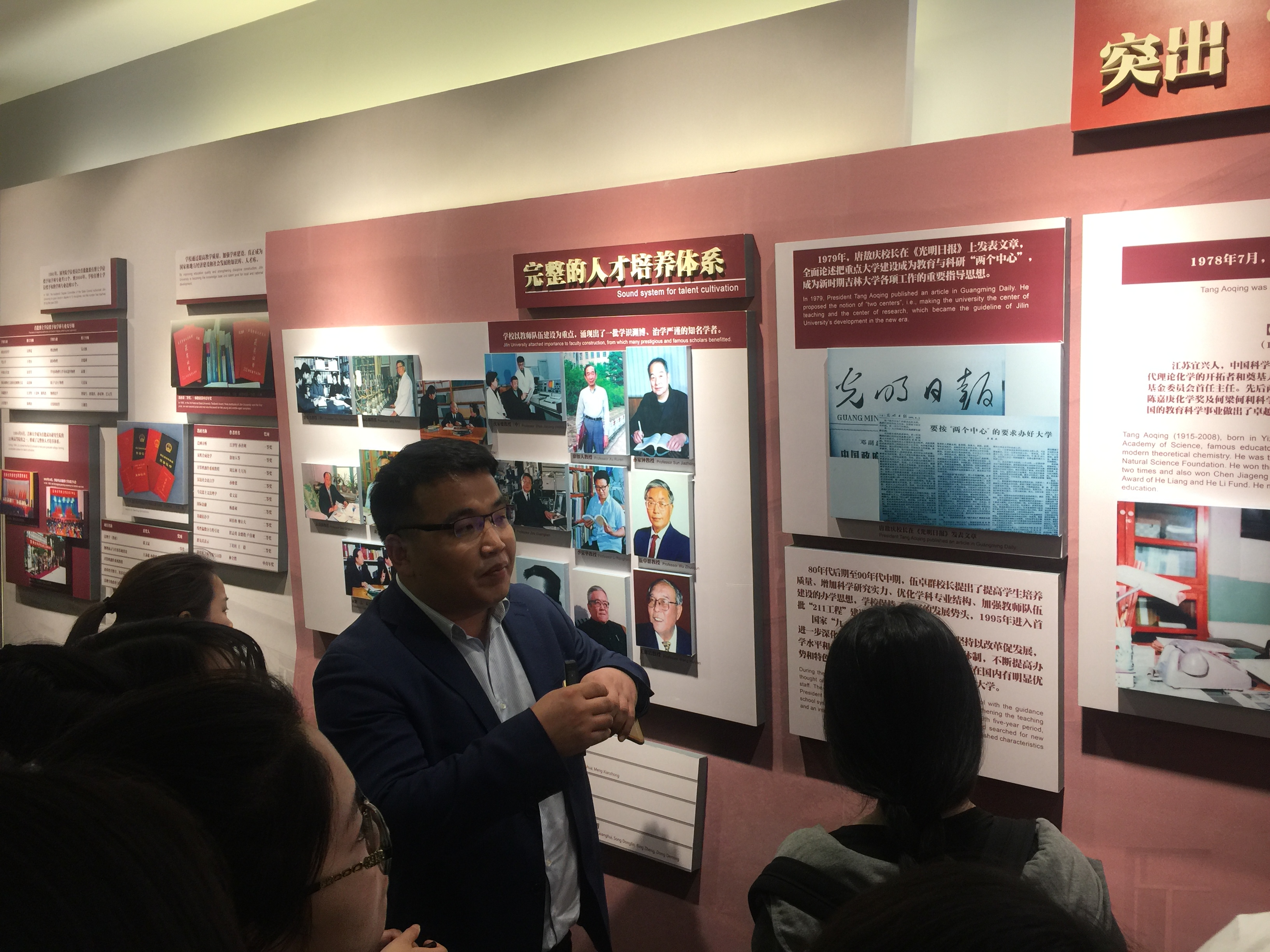 同学们在校史馆工作人员的带领下进行了参观,讲解员沿着“领导关怀、光辉岁月、继往开来、星光璀璨、杏坛翘楚、芝兰玉树”等10个展厅依次展开解说。参观过程中,同学们深刻认识了母校70余年的发展历程和改革之路,了解了母校从建校初始到六校合并再到当前,学校在人才培养、校园建设、学科建设、党政文化建设、对外交流等方面的政策和史实。校史馆以其图文并茂、馆藏实物丰富,配合场景、雕塑、模型和多媒体展示手段,将一幅古朴与现代相结合、科技与人文相辉映的校史长卷呈现在同学们的眼前。