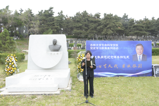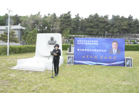 学院微生物学与免疫学系教工党支部书记单亚明代表教师发言 ,他说道“祭扫黄大年同志纪念碑,站在‘两个一百年奋斗目标的历史交汇点上,作为党员,我们应当继续传承发扬黄大年老师心有大我、至诚报国的爱国情怀。教书育人、敢为人先的敬业精神,淡泊名利、甘于奉献的高尚情操。以‘只要祖国需要,我必全力以赴’的坚定勇气。迎接‘双一流建设’船到江心的关键期,应对祖国发展改革攻坚的发力期,勇担职责使命,不负时代重托。”