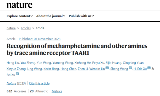 校友、中国科学院上海药物所副研究员王悦以共同第一作者的身份在国际著名学术期刊《自然》(Nature)上以“文章加速预览(Accelerated Article Preview,AAP)”形式在线发表了题为《Recognition of methamphetamine and other amines by trace amine receptor TAAR1》的最新研究成果(图一)。